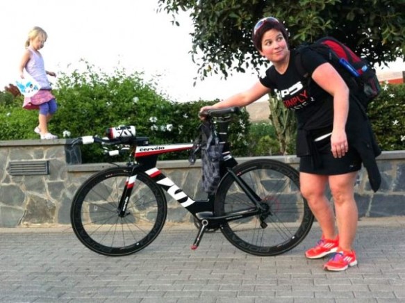 そして、16日の時点であるバイクサイトに、酷くぽっちゃりな女性がP5特別サイトネームであるP5SimplyFasterのT-Shirtsを着てP5を支えている。おそらくこのトライアスロン仕様バイクは、Campanoloのドライブパーツとホイール、COBBサドルが装着されてるのから見て、現地で1月18日の発表パーティーに呼ばれているプロトライアスロンチームのTeam TBB所属Caroline SteffenのCervelo P5だと予想。
