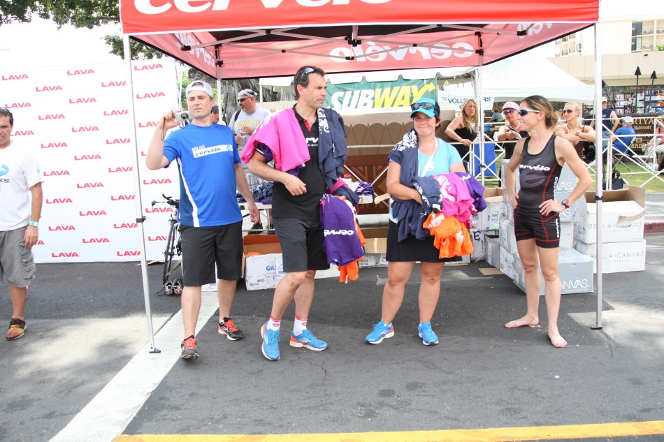 チェックインの手前では、Cerveloがブースを立て、出場するすべてのCerveloライダー達に、Cerveloの創立者であるPhil White(写真右から2人目)も参加し、2012年限定Tシャツを配っており、他にもProfile Design、QRのブランドも使用ライダー達に手渡していた。