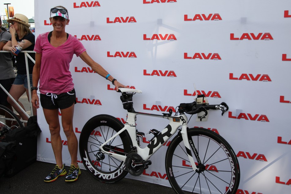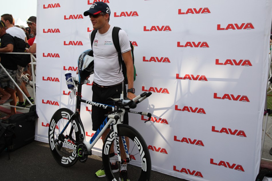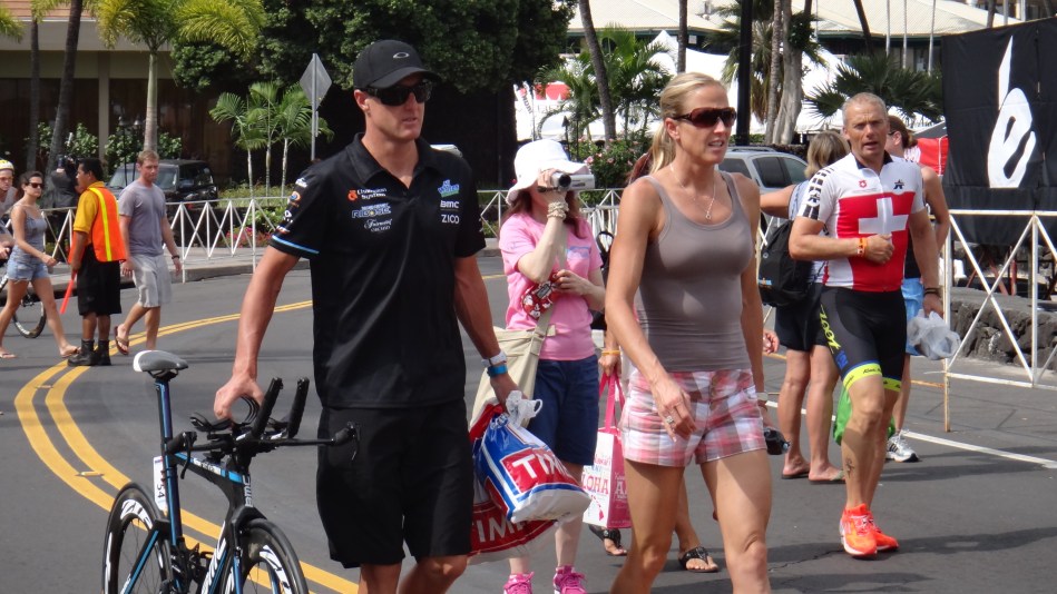 優勝候補であるスイス代表Caroline Steffenも多くの人に囲まれつつも、愛車のCervelo P5で、フィアンセでアイアンマン王者David Dellowと仲良く笑顔で登場。