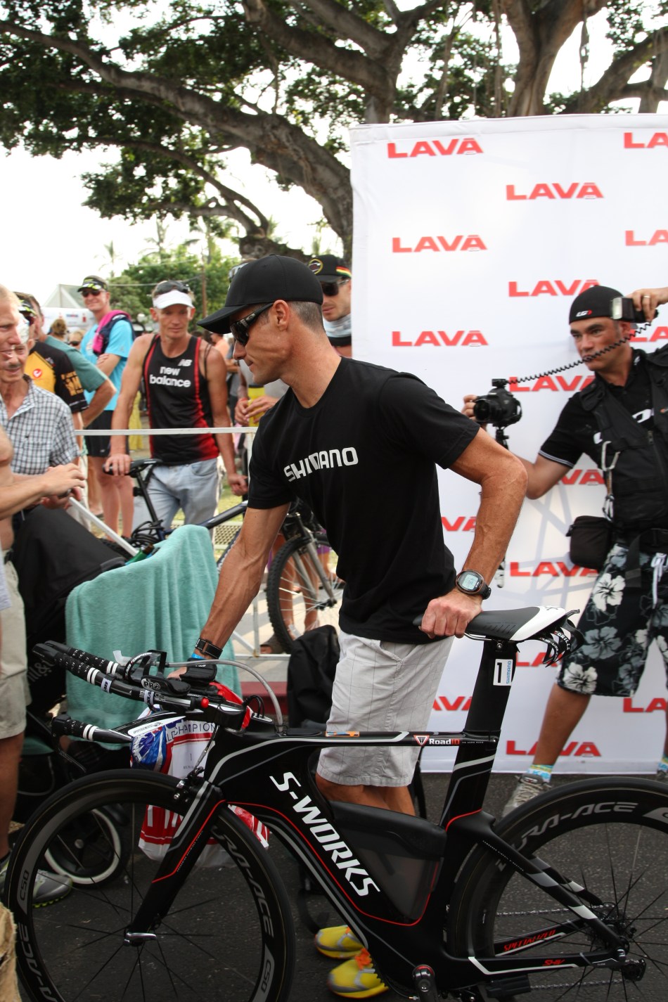 多くの人に囲まれるように、2010年世界王者Chris McCormackが、慣れたように落ち着いた様子で登場。スタイリッシュなバイクSpecialized ShivとオリジナルカラーZipp 808 Firecrestのペアホイール。