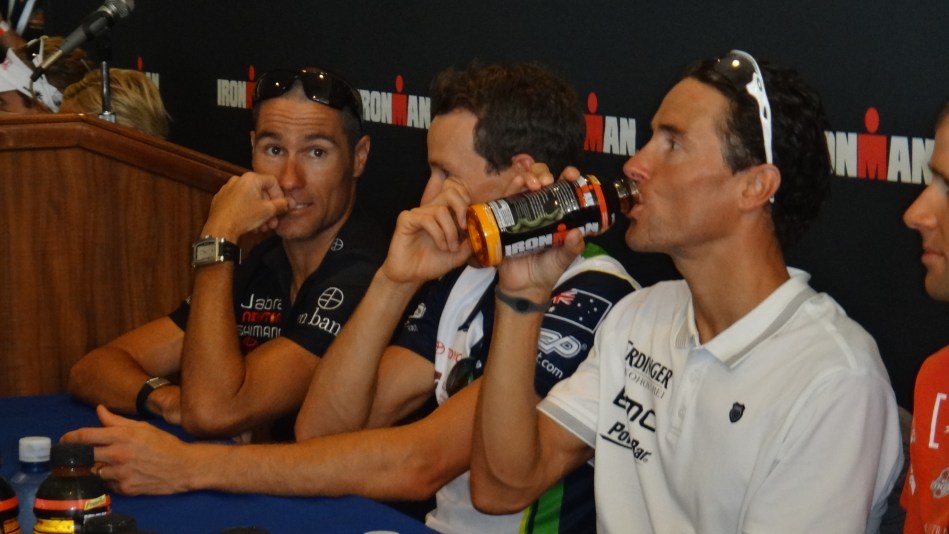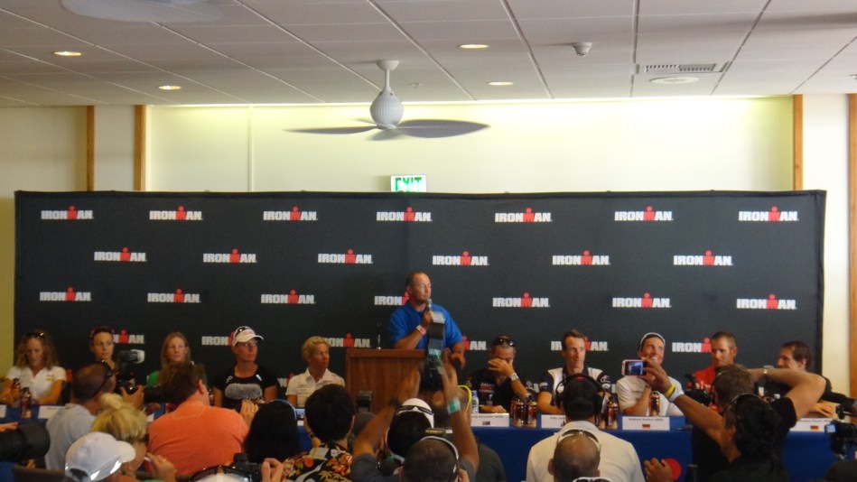 元プロトライアスリートで、現在解説等を請け負うっているGreg Welchから、1人ずつの選手紹介から始まり、その後多くのメディアから質問が飛び交い、特に、本命でもあり、今年のレースでは、あまり結果を残せなかったMirinda Carfraeと、去年同様に怪我に悩まされたPete Jacobsに対しての質問が特に多かった。