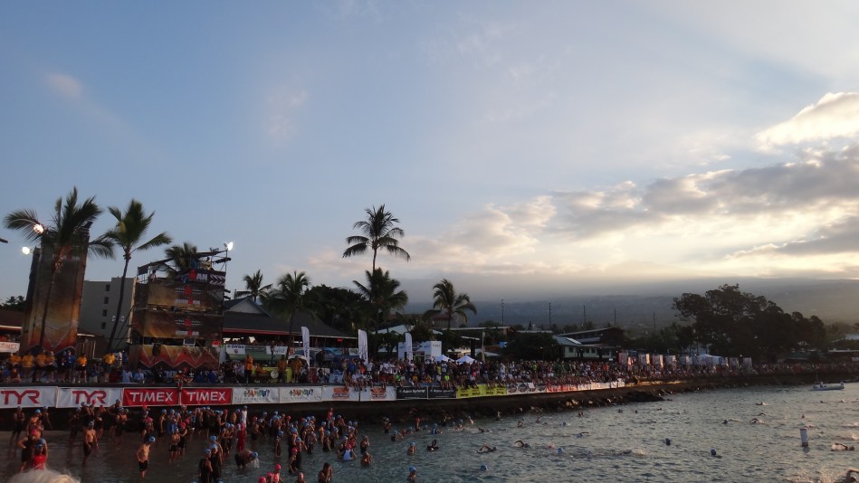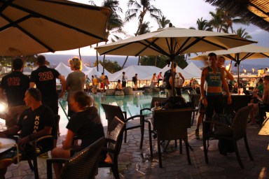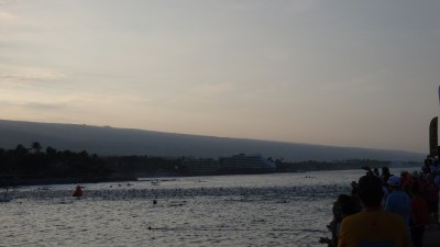 6 時30分のスイムスタートを前に、コナのカイルアベイのトランジションでの準備を終えた、選手達が続々とスタートのビーチやすぐ側のホテルのプールサイド で静かに、ストレッチやアップをしながら、気持ちや感情を整理し始めていた。どの選手もしっかりとした顔立ちで、緊張感も漂いながらも、自信に溢れた表情が垣間見れた。