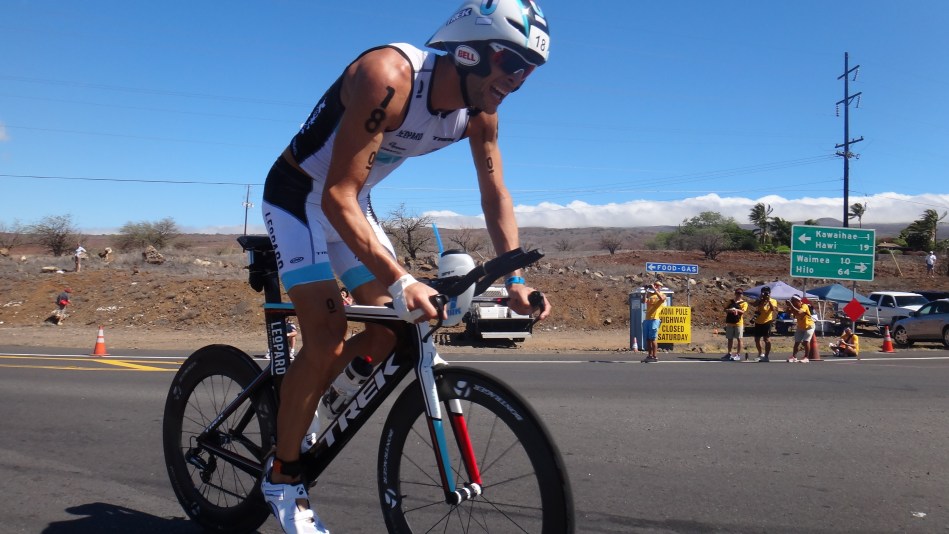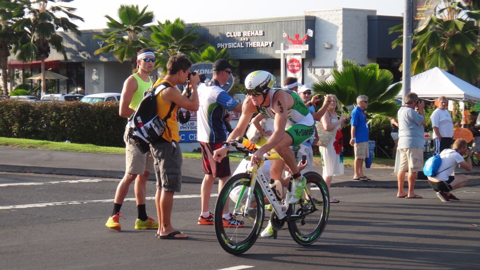 バイクスタート後、Stevensが後方とつけた1分程の差を詰められまいと、最初の10キロは、先頭を独走していたが、すぐ後ろからバイクの強いCave、Kessler、Ellisが、徐々に追いつき始め、Marshを含む6人の集団が構成され始めた。スイムで3分程遅れを取ってしまった、Steffenが、バイクの強さを前半から見せ始め、すぐさま先頭集団に追いつてから、Cave、Ellis、Steffenの3人で先頭を回して行く展開へ変わっていった。だが、Steffenが、ドラフティングペナルティーで、4分間ロスをしてしまったが、驚異的なスピードで、先頭の2人に追いつき、再度3人で先頭を過ごす展開になった。そして、Hawiを折り返した後、Caveもドラフティングペナルティーを取られてしまう結果になり、4分間ロスしてしまうことにもなる。