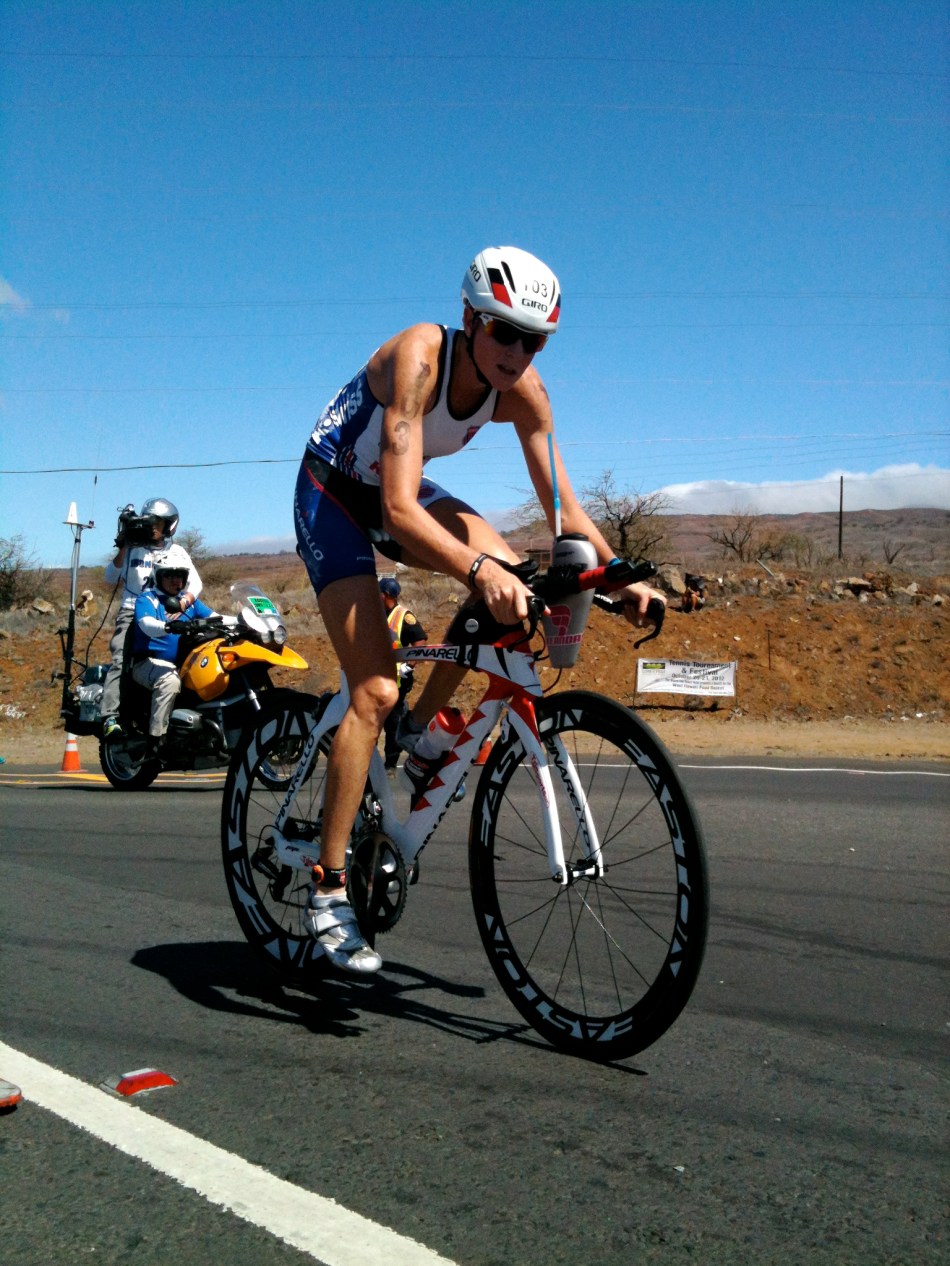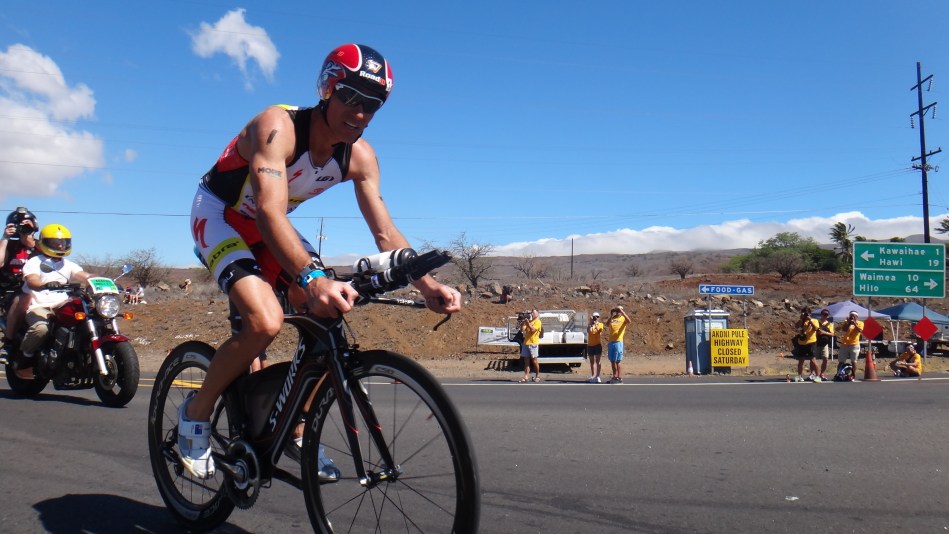 そのままの大きなパックで、約70キロ地点に差し掛かると、Jacobsが先頭を引っ張る等の場面もありながら、McKenzie、Guillaumeと共にアグレッシブな駆け引きが続いた。この時点でスイムで遅れたVanhoenacker、Kienle、Bockelも追いつくことができた。すぐさま、Vanhoenackerが、折り返し手前で先頭を奪い、そのままKienleと2人で逃げる展開に持ち込もうと、後続との差も1分程開き、自身の戦略を実行し始めた様に見えた。バイクスタート時から、自身の不調を訴えていたMcCormackは、次々とトレーニングパートナーのRonnie SchildknechtやPaul Amey等に抜かされ始めてから、Hawiの折り返し地点を通過して、すぐにリタイアを決めた。