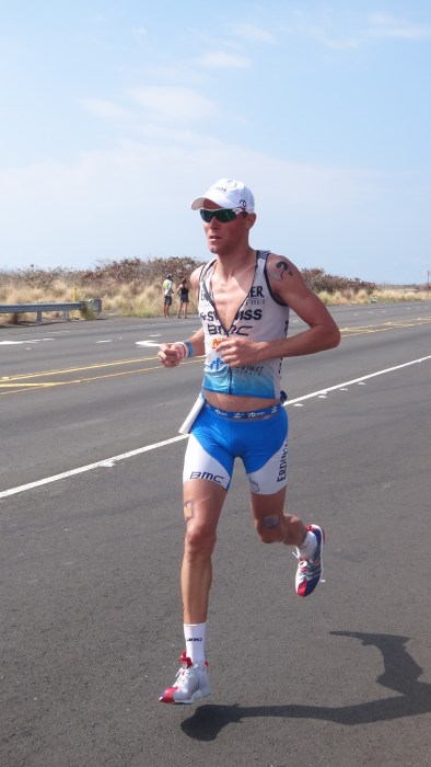 このままCaveが、タイミング良くペースを上げたことで、先頭を行くSteffenもペースが落ち始めたこともあり、徐々に差を詰め始めて行った。残り5キロを残す所で、CaveがSteffenに追いつき、数キロ程並走し、2人はトップ争いを繰り広げ始めた。バイクで脚を使いすぎてしまったのか、Steffenは、Caveのペースについて行くことができずに、2位へと落ちていった。コンスタントなペースをキープし、Caveがトップを走り始めた頃、残り2キロのPalaniロードの下り坂に差し掛かり、後ろを確認しつつも、勝利を確証するまでは、ペースを落とさずに、しっかりフィニッシュまで走り抜けた。