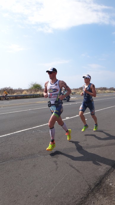 Steffenが順調なペースで先頭を走る中、ランスタートからCaveとEllisがクイーンKハイウェイまでの15キロ程を並走し続け、この3人を追いかけるCarfraeが着実に差を5分まで縮めた。クイーンKハイウェイのランコース上で、まずCaveが、Ellisを置き去りにした2位で走り始めた途端、すぐさま後ろから、素晴らしいランスピードでCarfraeが追いつき、丁度エナジーラボ(25キロ)の手前で抜かし2位へ浮上するかと思われた。だが、追いつかれたことを気づいたCaveは、スペシャルドリンクを受け取り補給した後すぐに、エナジーラボの下り坂でペースを上げ、逆にCarfraeとの差を開くことを始めた。