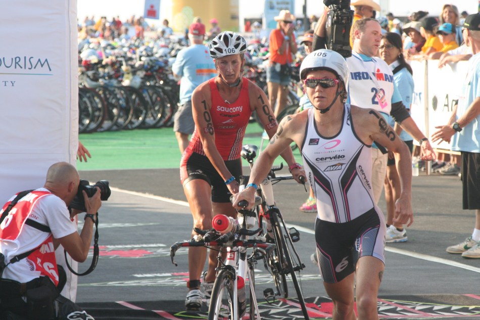 その後、第一集団のBoecherer、Jacobs、Mathews、McKenzie、Jurkiewicz、Dellow、Alexander、Henning、Van Lierde、O’Donnell、MRaelertの順で大きなパックが1分遅れでトランジションへ向かった。少し遅れて、Marino Vanhoenacker、Dirk Bockel、Chris McCormack、Timo Brachtが、スイムフィニッシュで、トランジションへ。バイクスタートで飛び乗った際、McCormackが Vanhoenackerに追突するというハプニングもあり、その影響でVanhoenackerにメカトラブルもあった様だ。その4分後、出遅れたドイツ勢Andreas RaelertやSebastian Kienleが続き、先頭集団までの大幅なギャップをバイクで埋める必要になってきた。