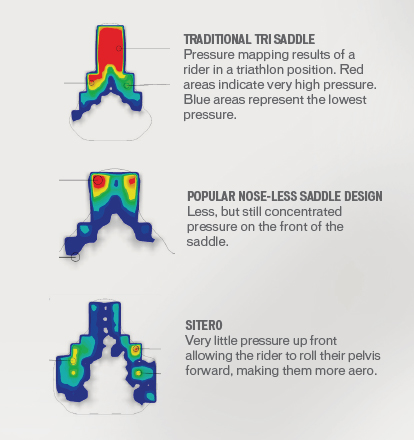 現在サドルマーケットで、人気を持つISM AdamoやCobb V-Flow Plusのサドル上の血流を良くするために開発され、不快感の少ないサドルが流行である。だが、Specializedが提示する、独自に持つバイクフィットシステムBG Fitからの科学的な根拠を元に、開発されたニューサドルSiteroは、サドルに乗っている時に、80%の血流の良さをうたっており、スタイリッシュなデザインだけではなく、従来のトライアスロンサドルに比べても、さらなるアグレッシブなポジションを取る場合も、サドル部分に不快感の少ないコンフォート重視のサドルだと述べている。下記の図の様に、サドル上にかかるプレシャーも、他のサドルに比べて、負荷が少ない結果が出ている。*上図:スタンダードなトライアスロン用サドル(Fizik Arione Tri2)、中央図:人気のある前空きサドル(ISM Adamo)、下図:Specialized Sitero