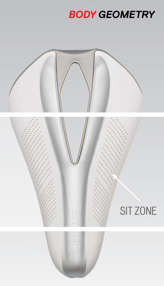 従来のサドルは、エアロポジション(前乗り)を取ることで、長時間乗っている際に、自然と尻が前に滑ってきてしまうことが多く位置が安定しない場合が多かったが、このSiteroは、先端に近い位置で座るのではなく、中央に座ることを重点に置き、体を安定させ、前後に動いてしまうブレを最小限に抑えるためにデザインされている。