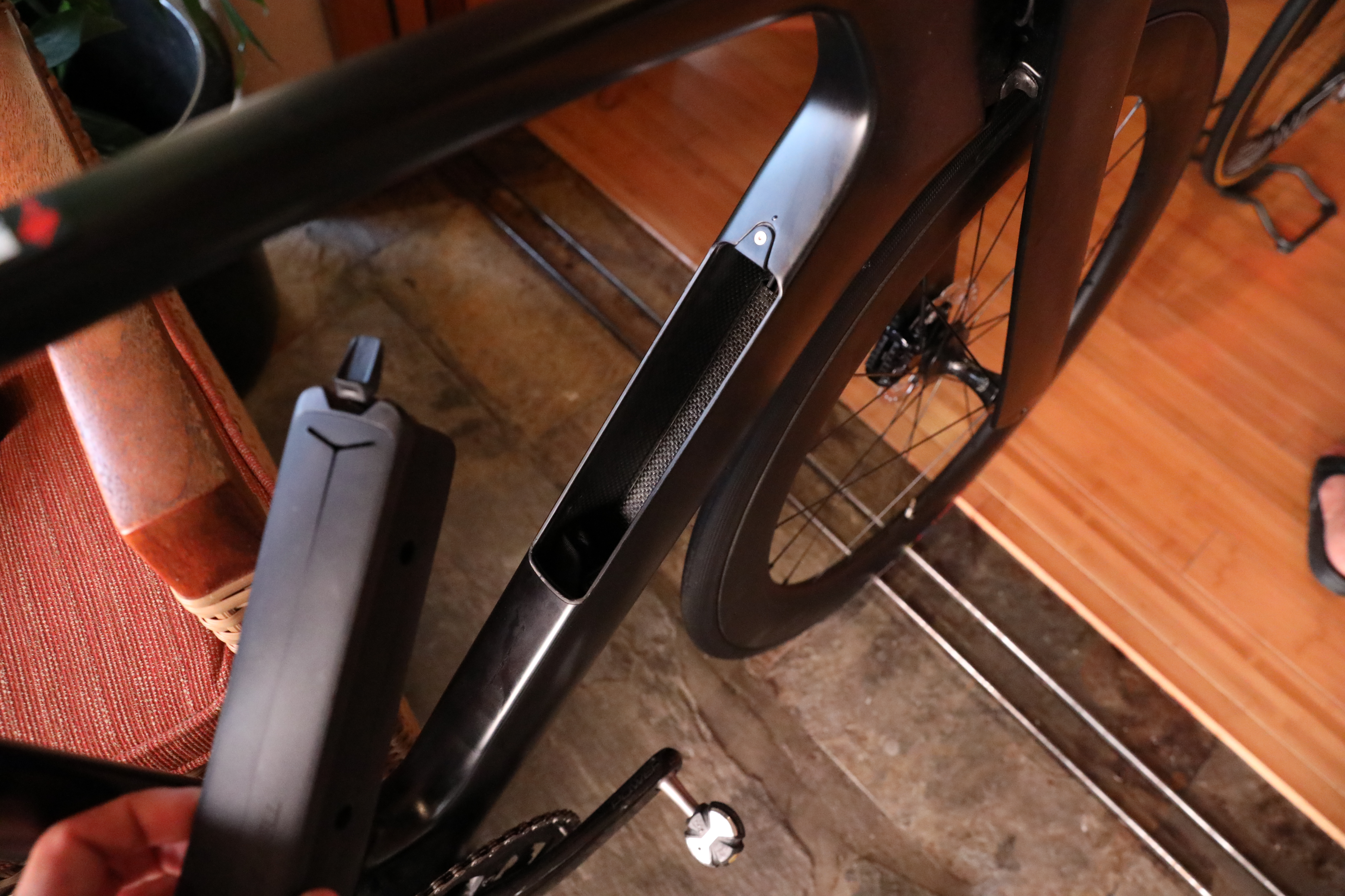 そして、ダウンチューブには、補給食を入れるシリコン素材のストレージを完備している。ここで気になるのが、スペアチューブなどのツールはどこに入れるのかだ。実は、このストレージを取ると、ツール用のSWATバッグがボトムブラケットの辺りに隠れて入っている。もし、ストレージが、トップチューブに必要であれば、2つのボルトがついているので、固定式のストレージシステムを使うことも可能だ。